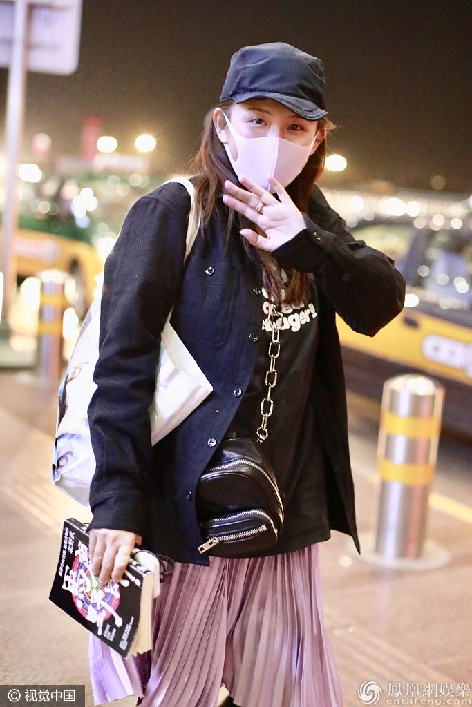 2019年10月29日,北京,热依扎现身机场。她素颜亮相,穿紫裙抱书赶路,见镜头不忘摘下口罩打招呼。 图片来源:阿珊/视觉中国