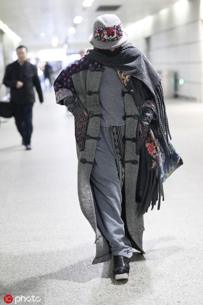 杨丽萍穿灰色民族服饰现身机场 摆“OK”手势长指甲抢镜