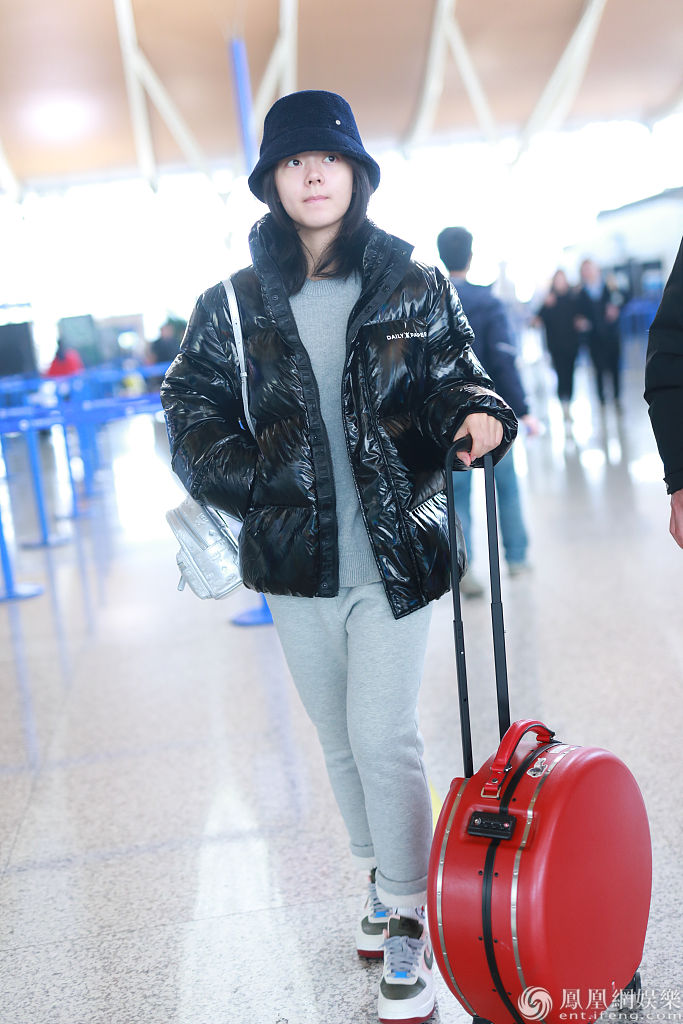 2019年12月17日,北京,赵今麦现身机场。她素颜戴渔夫帽穿一身灰色休闲装,外披黑色上衣,手拎红色个性行李箱又潮又美。