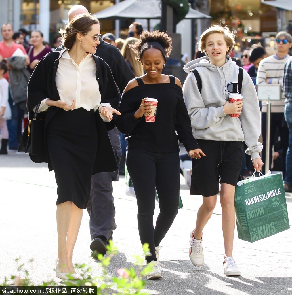 安吉丽娜·朱莉带两个女儿逛街 13岁希洛身高直逼170cm妈妈