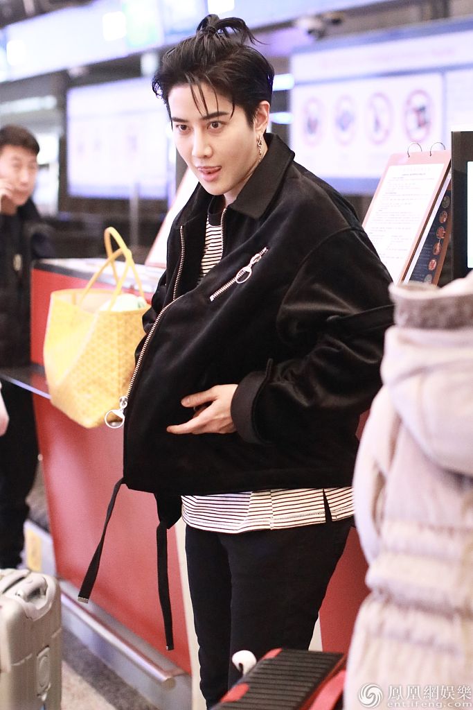 2019年12月24日,北京,泰国男星披拉·尼迪裴善官(Mike)现身机场。他扎小揪揪吐舌搞怪变狂野男孩,穿着条纹衫搭配黑色外套,衣着单薄尽显抗寒体质,风度与温度并存。