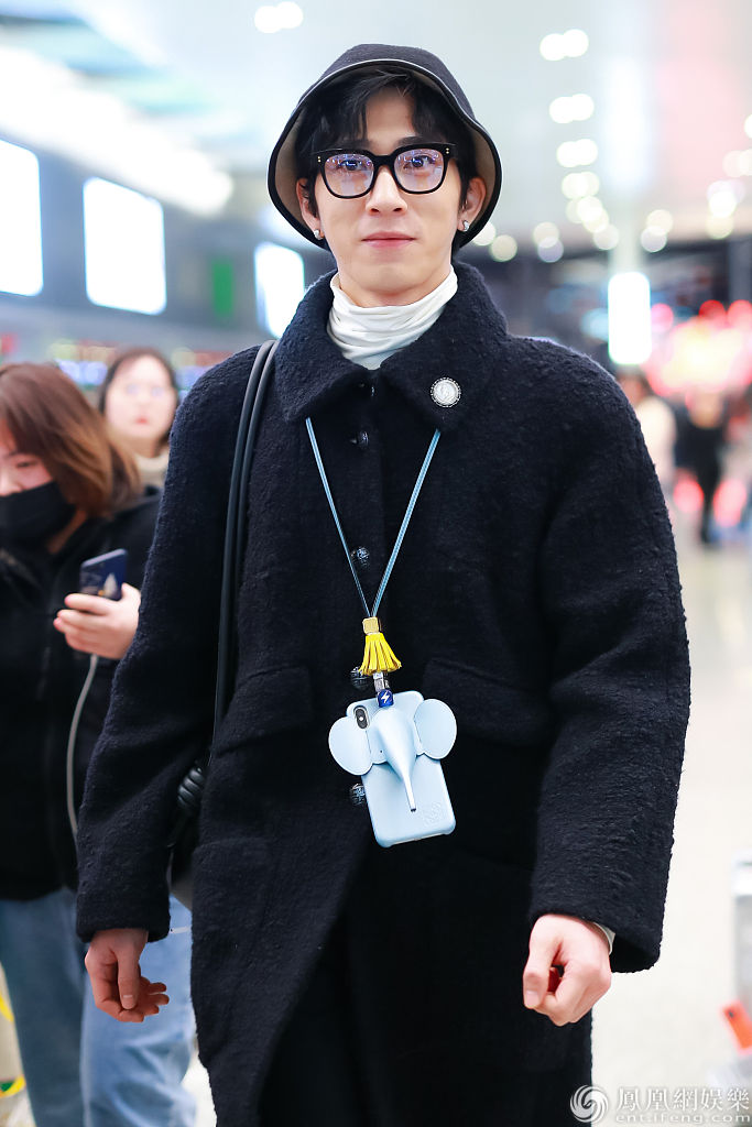 2019年1月9日,上海,井柏然亮相机场,他身穿黑色大衣搭配渔夫帽造型清爽帅气,充满文艺小哥哥气息,将手机挂在胸前,小飞象手机壳十分抢眼。