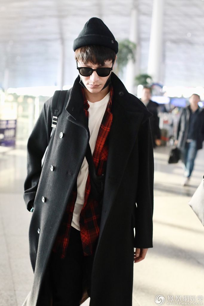 2020年1月15日,北京,陈坤现身机场。他素颜戴针织帽和墨镜,穿黑色大衣内搭格子衬衫