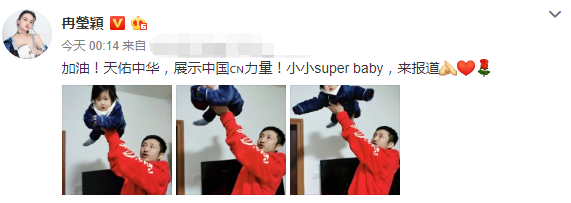 2月4日凌晨,冉莹颖在微博社交网上晒出家庭日常,并发文:“加油!天佑中华,展示中国力量!小小super baby,来报道。”