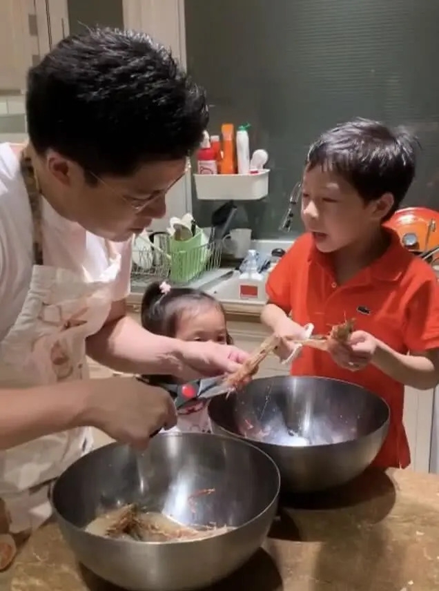 3月30日,霍启刚在个人社交软件分享了自己与大儿子霍中曦一起做虾的画面。