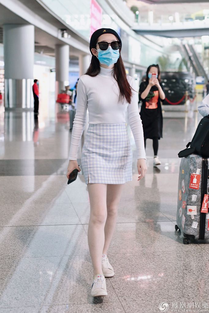 2020年5月2日,北京,蒋梦婕现身机场。她身穿白色长袖和浅蓝色方格裙,大秀美腿皮肤白到发光,身材简直绝了!