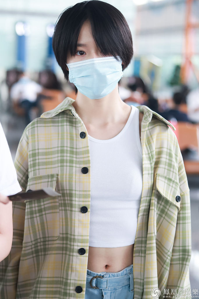 2020年5月13日,北京,成果现身机场。她依旧是短发造型,穿露脐装气质甜美清新。