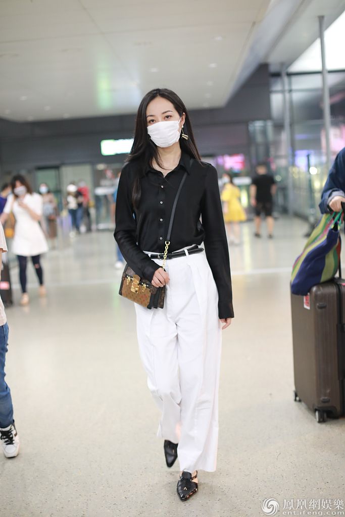 2020年5月24日,上海,韩雪现身机场。她穿黑衬衫和白裤简约穿搭文艺知性,眼神超A攻气十足。