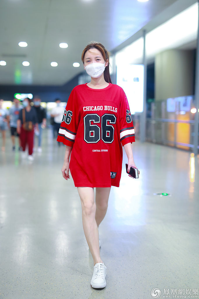 2020年8月25日,上海,金莎深夜现身机场。她身穿红色数字长t恤素颜搭机皮肤白嫩,秀美腿造型休闲身材超好。