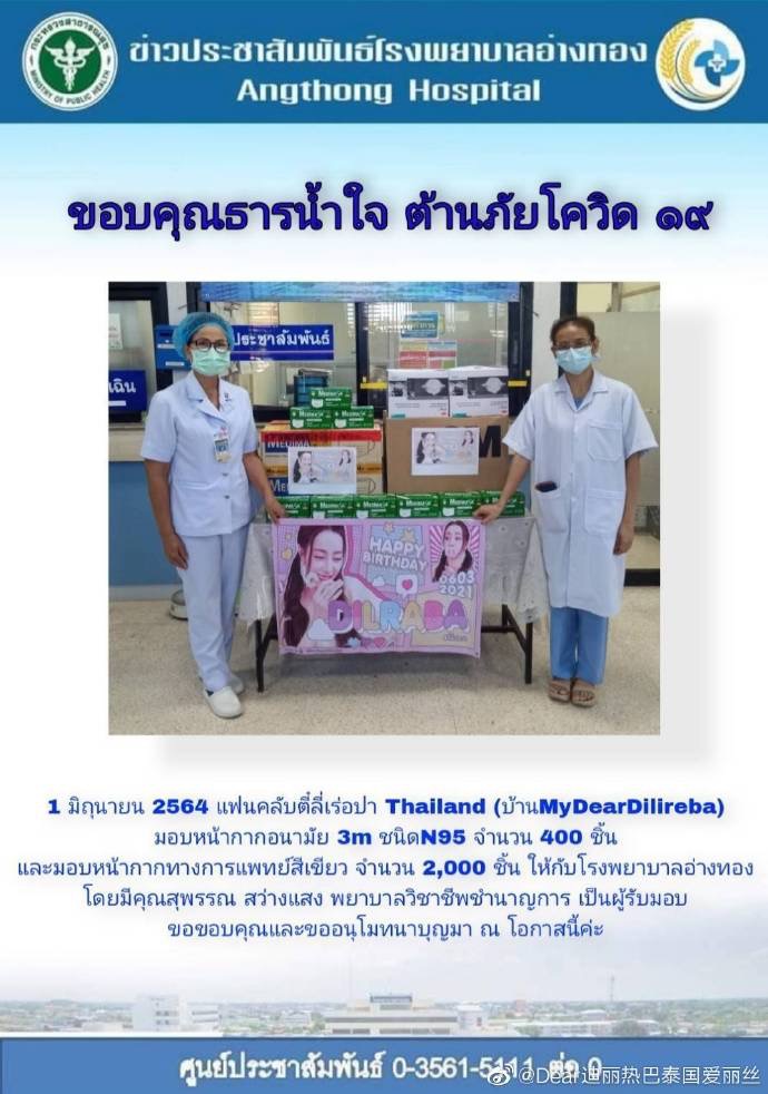 海外粉丝也不甘落后,由于目前国外疫情不容乐观,热巴的泰国粉丝也以热巴的名义,向泰国的医院和红十字会捐赠了口罩等物资助力抗疫。