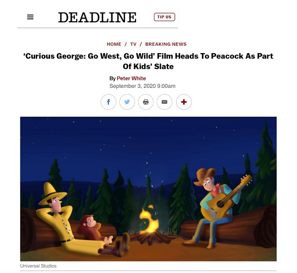 知名美国媒体Deadline报道《好奇猴乔治:西部大冒险》上映时使用的这个影片截图的分镜头就是吴婧设计的