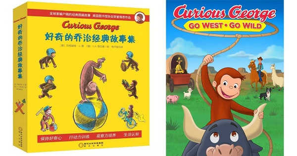 《好奇猴乔治》的故事在中国也是家喻户晓的童书系列,图右为《好奇猴乔治:西部大冒险》的电影海报