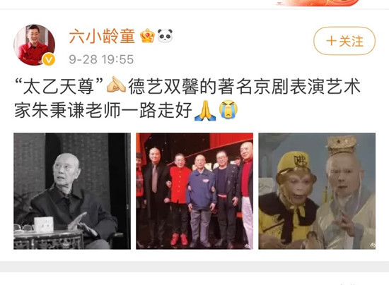 得知朱秉谦先生去世的消息后,《西游记》中孙悟空的扮演者六小龄童发文悼念,他写道:“‘太乙天尊’德艺双馨的著名京剧表演艺术家朱秉谦老师一路走好。”