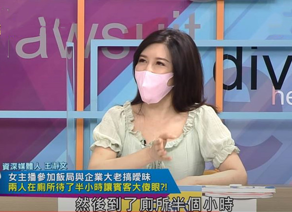 资深媒体人王瀞文曾是加拿大新闻主播,最近她在节目中爆料主播圈内幕,某一组女主播疑在厕所与知名企业家“约会”,让现场来宾非常傻眼。