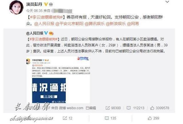 前亚姐冠军彭丹10月22日转发李云迪被抓的新闻,并附文:“善恶终有报,天道好轮回。支持朝阳公安,感谢朝阳群众。”此文立即引来众多网友围观评论,并好奇这两人结怨原因。