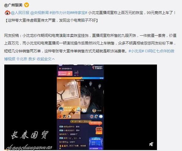 爆料称,小沈龙炒作期间和电商演剧本卖珠宝挂饰,直播间宣称所售的九眼天珠,一件就值一套房,价值上百万元,而小沈龙和电商直播间一顿演戏操作后居然99元上车销售,众多不明真相被忽悠网友纷纷下单,短短几分钟销售两万单,这种夸张夸大宣传单销售方式无疑就是欺诈消费者。