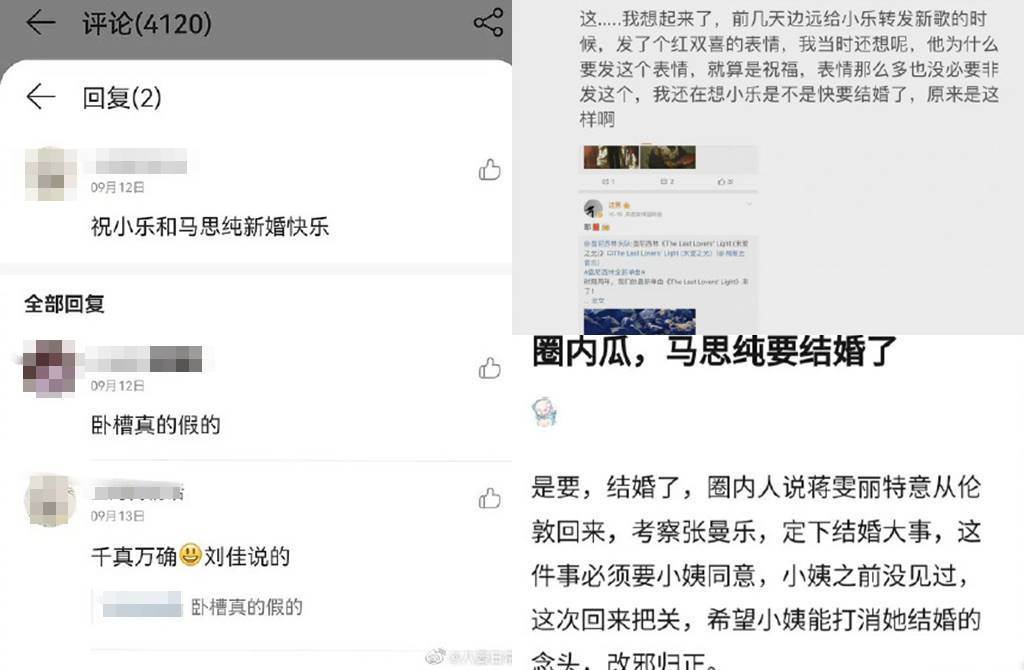马思纯今年3月被拍到和小4岁张哲轩十指紧扣约会恋情曝光。有网友9月时,就留言祝福小乐(张哲轩昵称)和马思纯新婚快乐,粉丝追问消息来源,他表示是盘尼西林吉他手刘家说的,强调消息千真万确。另有网友发现,之前边远转发张哲轩新歌时,发出双喜符号,当时不了解除了新歌外,另一喜从何而来,现在觉得原来早有暗示,不过也有另一说法是准备结婚但还没结呢,马思纯的小姨蒋雯丽还特地从英国回来,考验张哲轩值不值得托付。对于马思纯秘婚一事,外界都相当不看好,因为张哲轩争议话题不少。