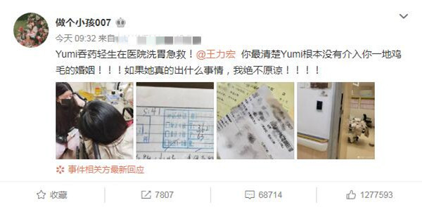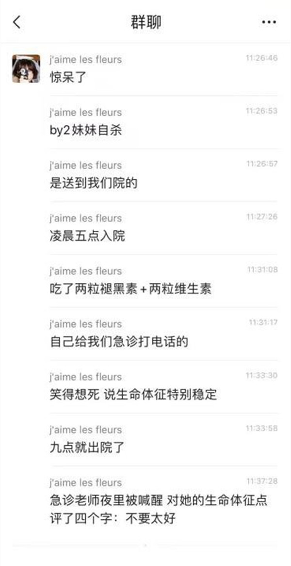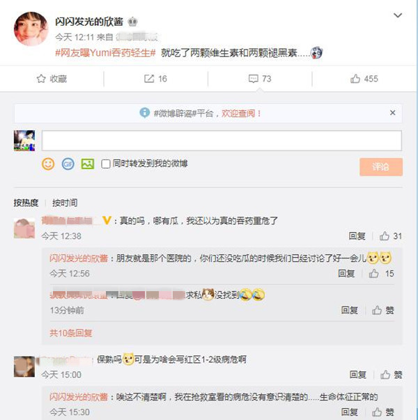 网友“闪闪发光的欣酱”在Yumi爆出轻生后,发文称:“#网友曝Yumi吞药轻生# 就吃了两颗维生素和两颗褪黑素.....”,同时透露自己的朋友就是该医院的医护人员,Yumi凌晨5点自己到医院挂急诊,“吃了2颗维生素和褪黑激素,笑得想死,说生命征象特别稳定,急诊医师还对她做出4个字的评论:不要太好。”9点就出院了。
