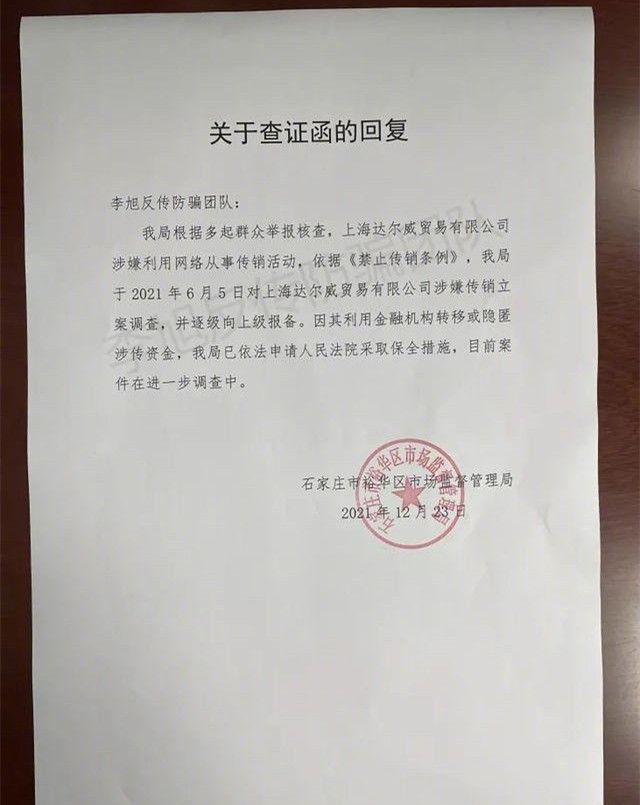据石家庄市裕华区市场监督管理局对“李旭反传销团队”《查证函》的回复,该局早在今年6月5日就已对上海市达尔威贸易有限公司涉嫌传销进行立案调查,“因其利用金融机构转移或隐匿涉传销资金,该局已依法申请人民法院采取保全措施,目前案件在进一步调查中”。有消息称,石家庄市裕华区市场监督管理局相关人员曾表示,达尔威公司此次被财产保全冻结的资金高达6亿元(分两次冻结,主体公司被冻结3亿元,代理商及团队长被冻结3亿元)。