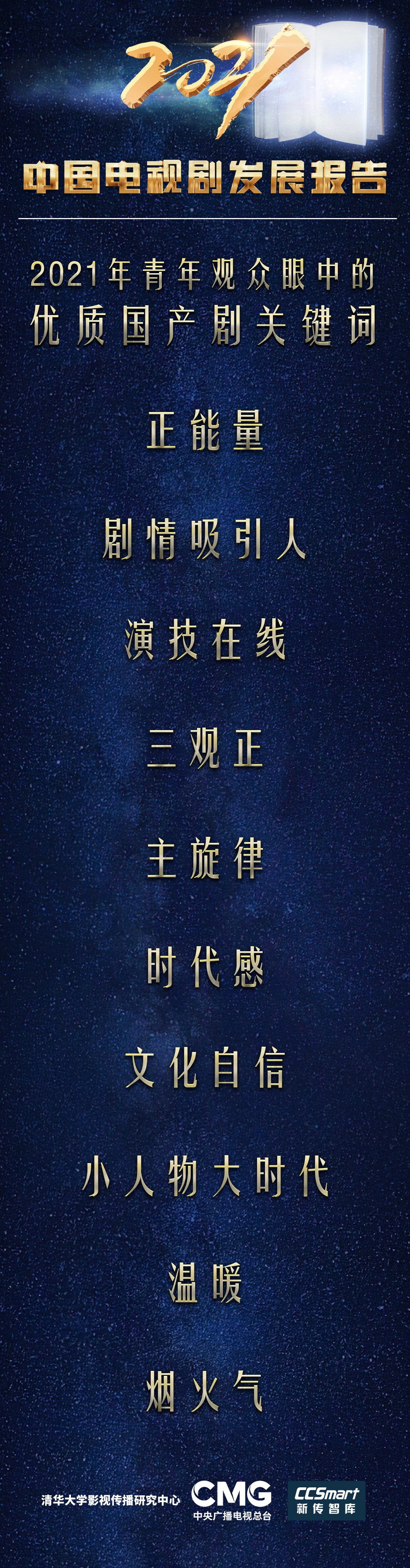 2021年青年观众眼中的优质国产剧关键词“正能量、剧情吸引人、演技在线、三观正、主旋律、时代感、文化自信、小人物大时代、温暖、烟火气”等关键词描绘出了青年观众对优质国产剧的期待!