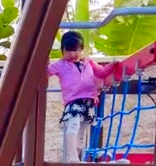 章泽天的5岁女儿站在滑梯上,穿着一件粉色外套,留着齐刘海皮肤白皙可爱,享受着童年的快乐时光。