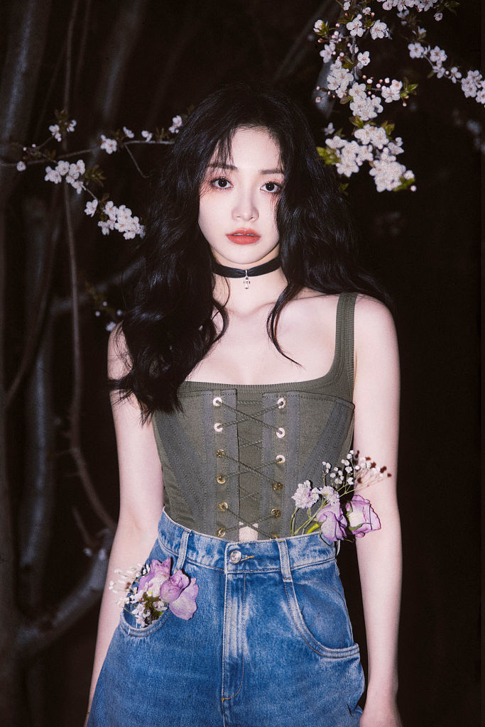 2022年4月24日,周洁琼发布一组纯欲风写真,粉色花朵映衬精致容颜。