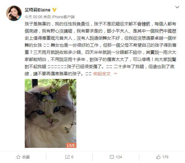 多年来,成龙对吴绮莉母女都不闻不问,她一个人负担起照顾女儿的责任。早年曾传出吴绮莉母女不时地向成龙要钱,而拥有上亿身家的成龙,却公开表明一毛钱也不会分给她们。对此,吴绮莉近日突然发文,称“孩子是无辜的,我的任性我负责任,孩子不是犯错从来都不会体罚。”吴绮莉自认有野心,但希望“自己的孩子得到尊重?”,同时似乎向成龙喊话“三天两月就说多少钱、四天半年就说一分钱都不给你,其实说一两次大家都能明白,不用说足20多年,对孩子的伤害太大了,可以停吗!”吴绮莉仍很自责地向大家说声“对不起,我错了。”很心疼孩子已经很受伤了。再一次拜托,“二十多年了我错,但这也到了底线,请不要再伤害无辜的孩子。”吐出母亲疼爱孩子的心声。