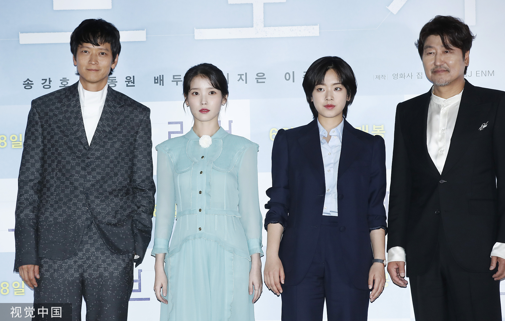 5月30日,韩国,电影《掮客》记者会在首尔龙山举行,演员宋康昊、姜栋元、李知恩(IU)、李珠英等出席。