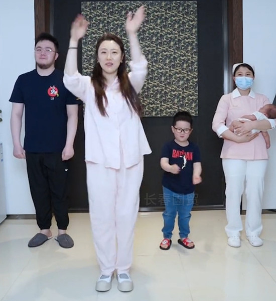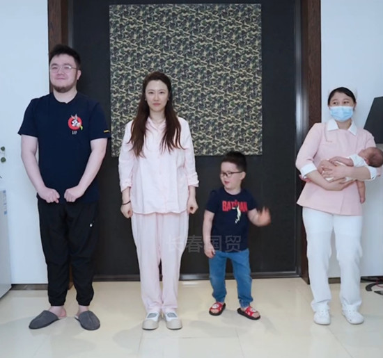 巴图身边的妻子王博谷产后恢复得不错,一家人手舞足蹈,脸上洋溢着笑容,画面温馨有爱。