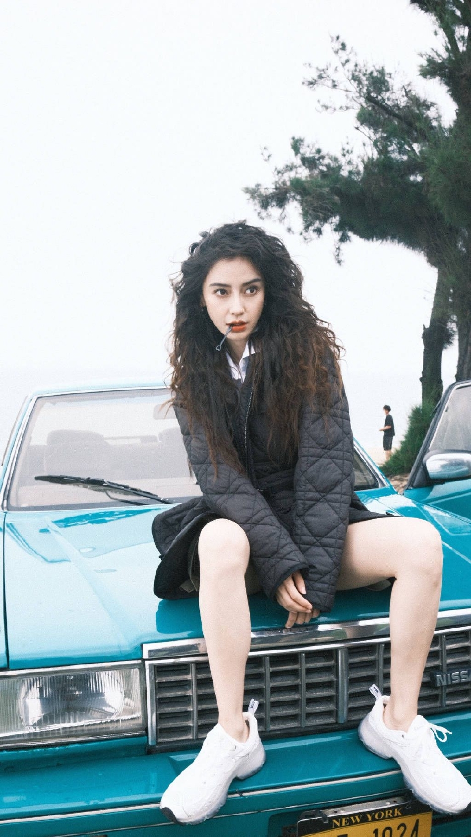 Angelababy海边大片明艳动人 羊毛卷发造型尽显港风韵味