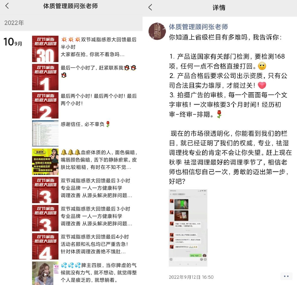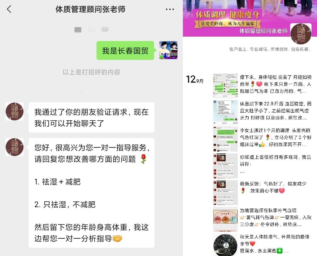 什么神奇的瘦身方法,竟能在一个月瘦十多斤、短短的半年时间内瘦身70多斤?于是长春国贸扫码加了电视屏幕上的名为“体质管理顾问张老师”微信,简单填写了身高体重年龄等情况后,这个微信号开始各种销售,各种优惠,各种打折,每天发来数条消息,推荐购买。这种瘦身推介,您会相信吗?
