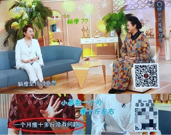另外,节目中还找了好几位瘦身成功的女士,利用前后对比照片的形式证明“疗效”,并且在节目进行中,还不时地提醒观众记得扫描屏幕上的二维码。