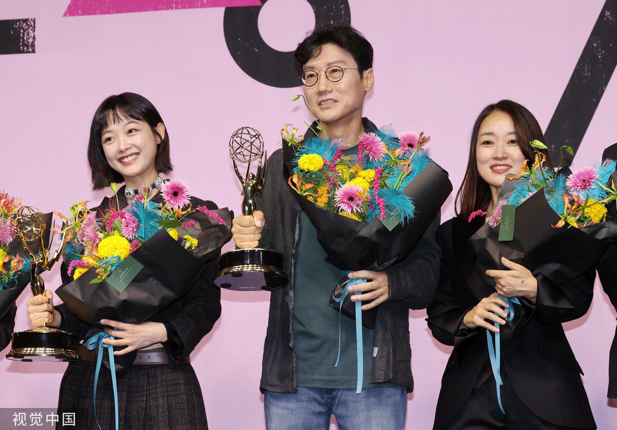当地时间2022年9月16日下午,韩国首尔,《鱿鱼游戏》艾美奖获奖纪念发布会在威斯汀酒店举行。导演黄东赫,演员李瑜美,制片人金智妍,美术设计蔡京善,以及获奖的动作导演、特技演员等出席发布会。 《鱿鱼游戏》在第74届艾美奖电视剧单元中,黄东赫导演获得导演奖,演员李政宰获得最佳男主角奖,以及获得最佳客串演员、最佳视觉效果、最佳特技表演、最佳制作设计。