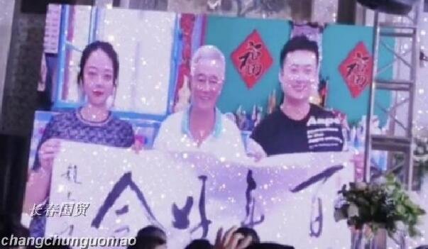 现场大屏幕上,播放了赵本山老师与新郎新娘的合影照片。65岁的本山大叔满头白发面带笑容地站在中间,两位新人分列两边,三人拿着赵本山书写的“百年好合”。师父虽然没有亲临现场,也给足了弟子路遥的面子。