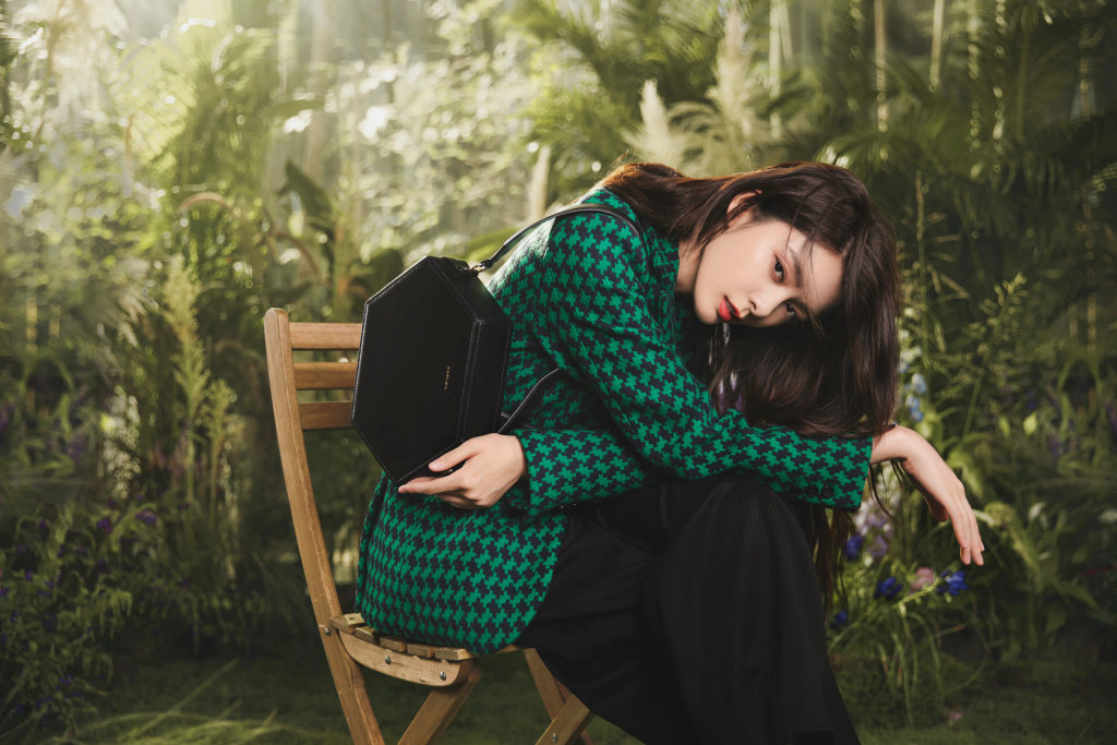 傅菁自然缤纷感秋冬品牌写真 背景绿意盎然对镜表现力超绝