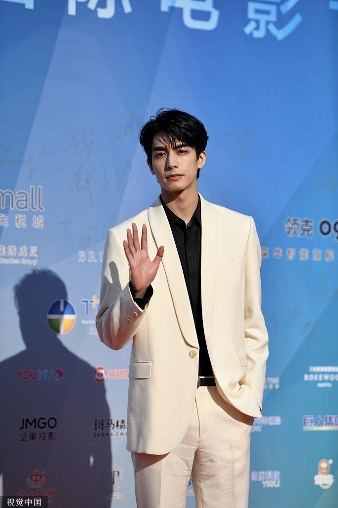2022年12月24日,三亚,2022年第四届海南岛电影节闭幕红毯造型亮相,图为宋威龙。白色西装搭配黑色内搭,帅气十足。