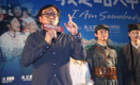 赵忠祥登台获两人搀扶 与女粉丝雨中合唱