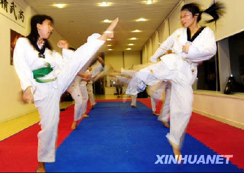 几位深圳的年轻人在业余时间练习跆拳道(10月13日摄)。